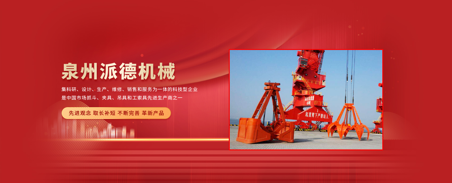 泉州派德機械有限公司成立于2012年5月,位于全國文明的古城福建泉州,公司擁有各類型專業(yè)員工82人,其中高級工程師1人,工程師4人,助理工程師5人,是一家集科研、設計、生產(chǎn)、維修、銷售和服務為一體的科技型企業(yè),是中國市場抓斗、夾具、吊具和工索具先進生產(chǎn)商之一。產(chǎn)品采用國內(nèi)外先進的設計方案、技術規(guī)范、制造過程、工藝流程和服務,憑借在抓斗、夾具、吊具和工索具領域的超前設計理念和成熟的技術、工藝和管理,在抓具領域迅速崛起。